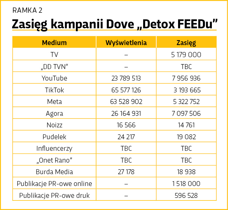 Wyniki badania przeprowadzonego w ramach programu „Dove Self-Esteem” stały się impulsem do opracowania i wdrożenia kampanii społecznej „Detox FEEDu”. Jej celem jest zwrócenie uwagi na konieczność świadomego korzystania z social mediów oraz podjęcie realnych działań wspierających nastolatki i ich rodziców, aby potrafili zidentyfikować toksyczne treści i powiedzieć im „Stop!”.
