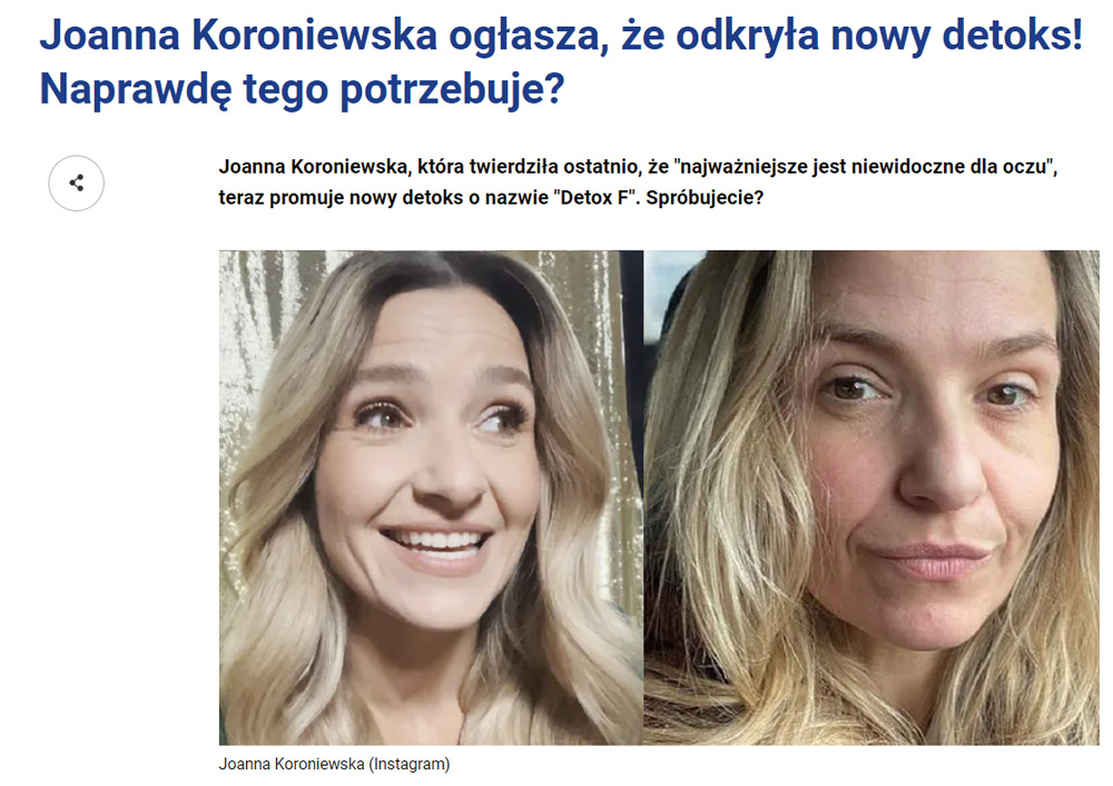 Tydzień przed planowanym launchem na jednym z portali plotkarskich pojawił się artykuł mówiący o tym, że Joanna Koroniewska reklamuje na swoim profilu na Instagramie nowy produkt DetoxF, dzięki któremu każda dziewczyna i kobieta poczuje się zdrowsza, lżejsza i piękniejsza. Celem publikacji było wywołanie buzzu i kontrowersji wokół Influencerki, która kojarzy się z naturalnością i pokazywaniem się bez filtrów.