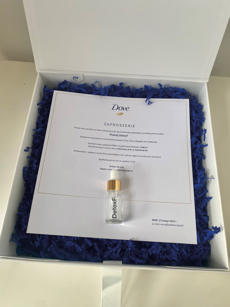 1 marca 2023 r. odbyła się konferencja prasowa, na którą zostali zaproszeni przedstawiciele mediów opiniotwórczych, lifestyle’owych, kobiecych oraz handlowych, kosmetycznych i marketingowych. Dziennikarze otrzymali wcześniej niestandardowe zaproszenie z pustą fiolką kosmetyczną z etykietą „DetoxF” jako bezpośrednie nawiązanie do launchu nowego produktu. Celem było wywołanie efektu zaskoczenia. Na miejscu, po rozpoczęciu spotkania okazało się, że marka Dove nie wprowadza nowego kosmetyku, ale po raz kolejny podejmuje ważny i trudny temat.