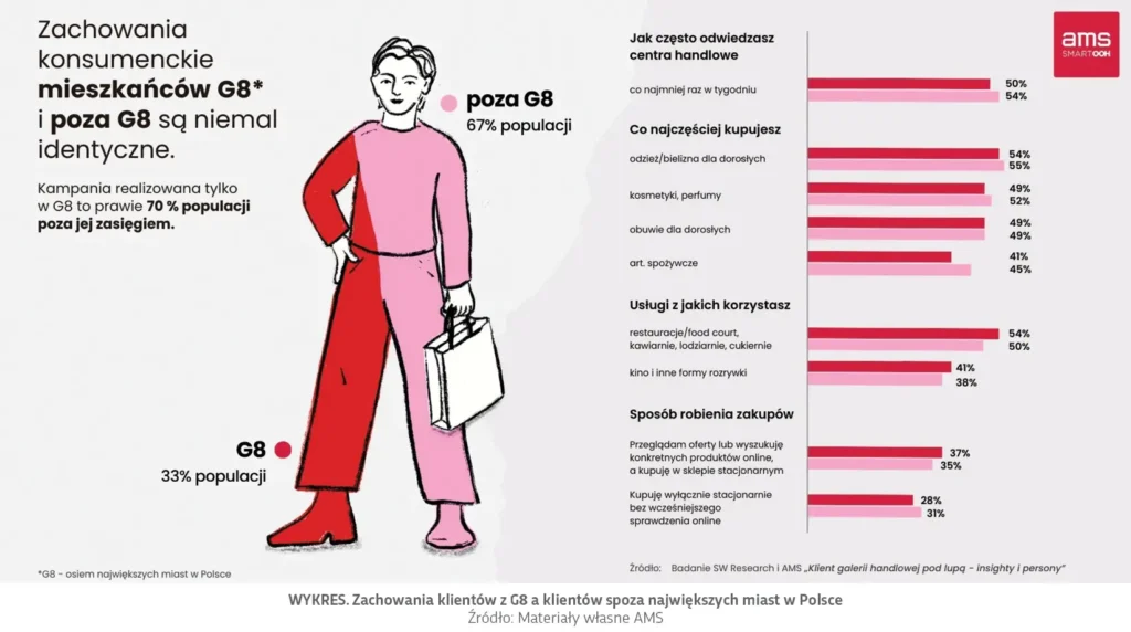 W wielu organizacjach i agencjach wciąż panuje przekonanie, że najbardziej wartościowi klienci zamieszkują największe miasta. Tymczasem dane z raportu SW Research i AMS wskazują, że różnice między zachowaniami klientów z G8 a klientów spoza największych w Po lsce aglomeracji nie są istotne statystycznie – zarówno w częstotliwości wizyt, strukturze zakupów, jak i w sposobie łączenia kanałów online i offline (wykres).