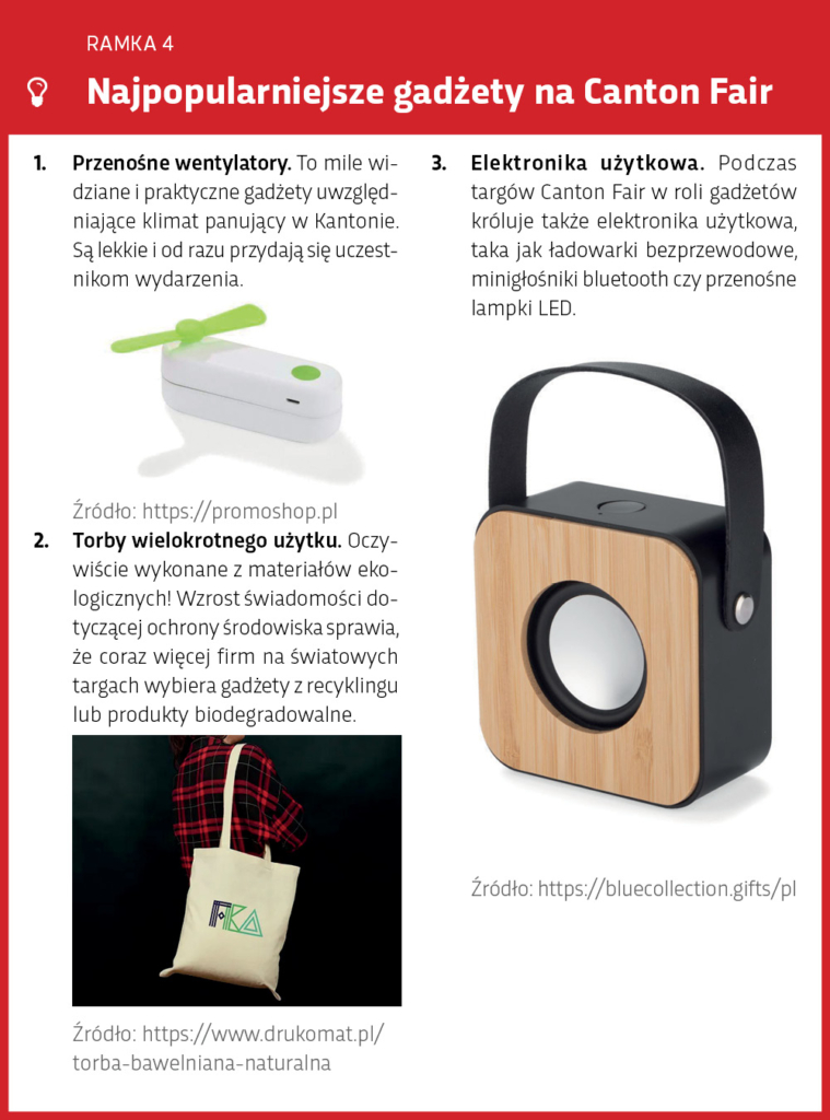 To największe targi handlowe w Chinach, odbywające się dwa razy w roku, które przyciągają tysiące wystawców z różnych branż: od elektroniki po tekstylia. Dlatego też gadżety reklamowe wręczane podczas tej imprezy odzwierciedlają różnorodność prezentowanych branż. Tu również dominują przede wszystkim praktyczne masowe produkty promocyjne.