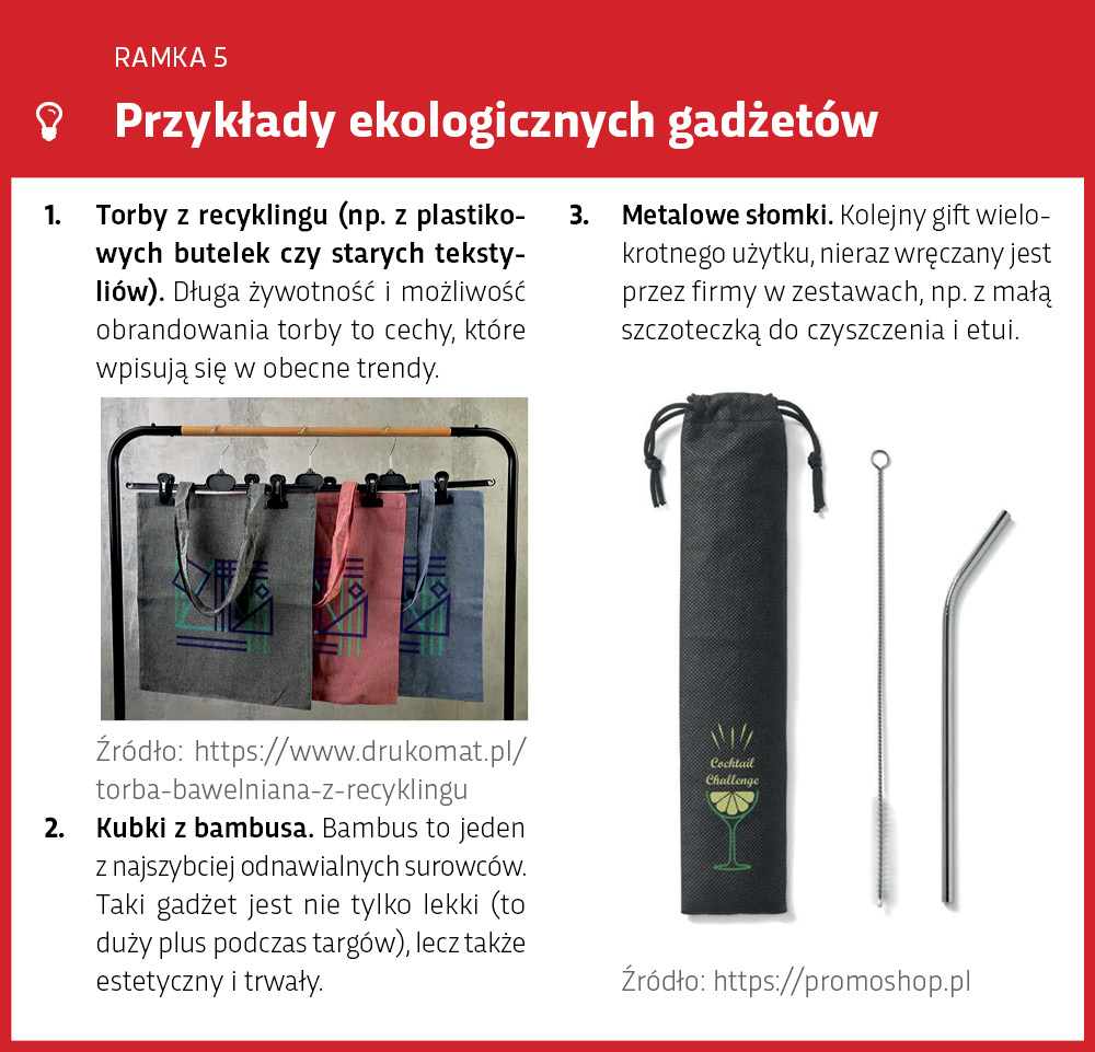 Wraz z postępem technologicznym i zmianami oczekiwań konsumentów zmieniają się także gadżety. Dziś tradycyjna ulotka reklamowa może być odbierana jako mało ekologiczny sposób na promocję podczas targów. Podobnie plastikowe długopisy, kolejny breloczek lub smycz. Marki dostosowują się do nowych realiów targowych, w których stoiska wyróżniają się giftami ekologicznymi, funkcjonalnymi i użytecznymi.
