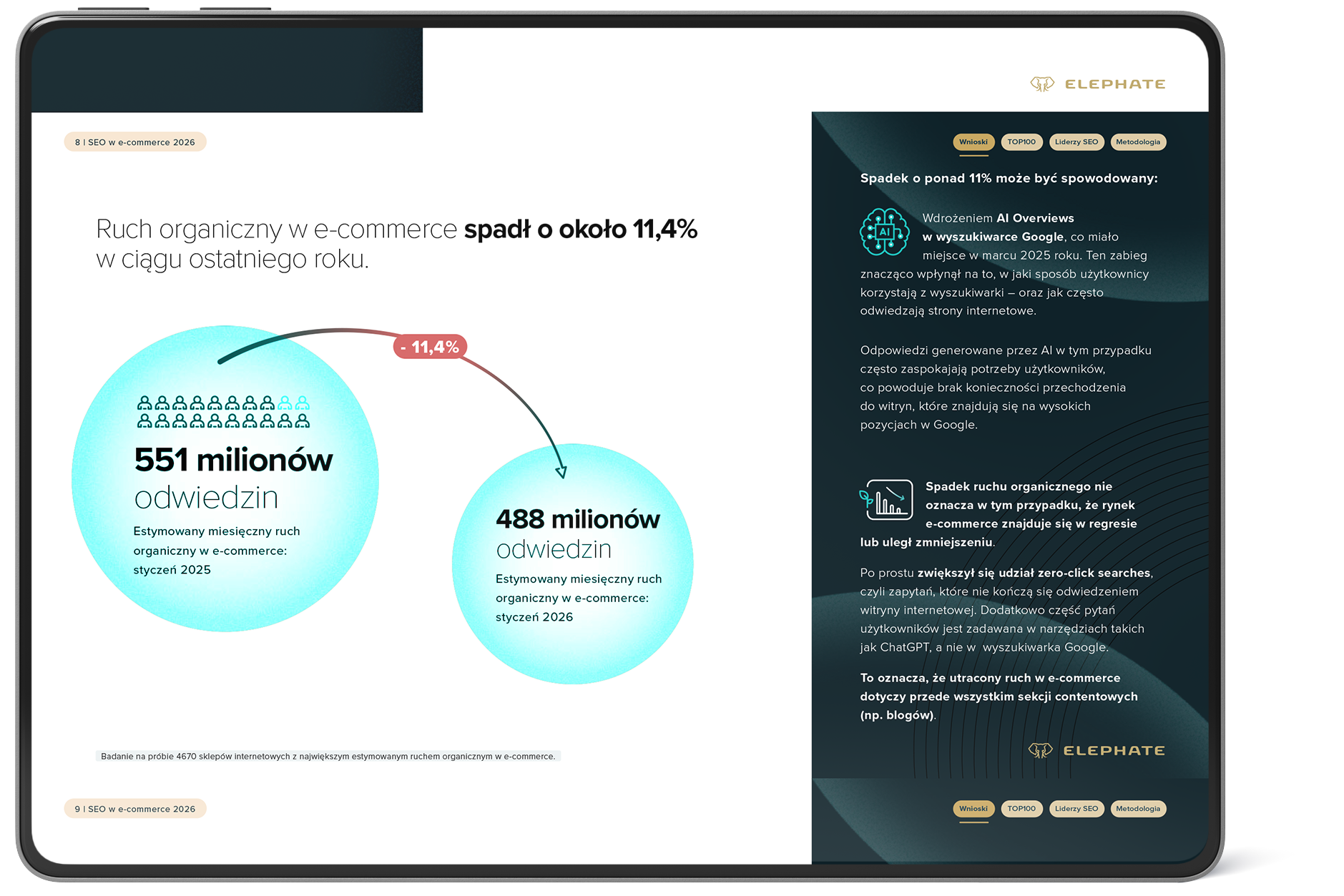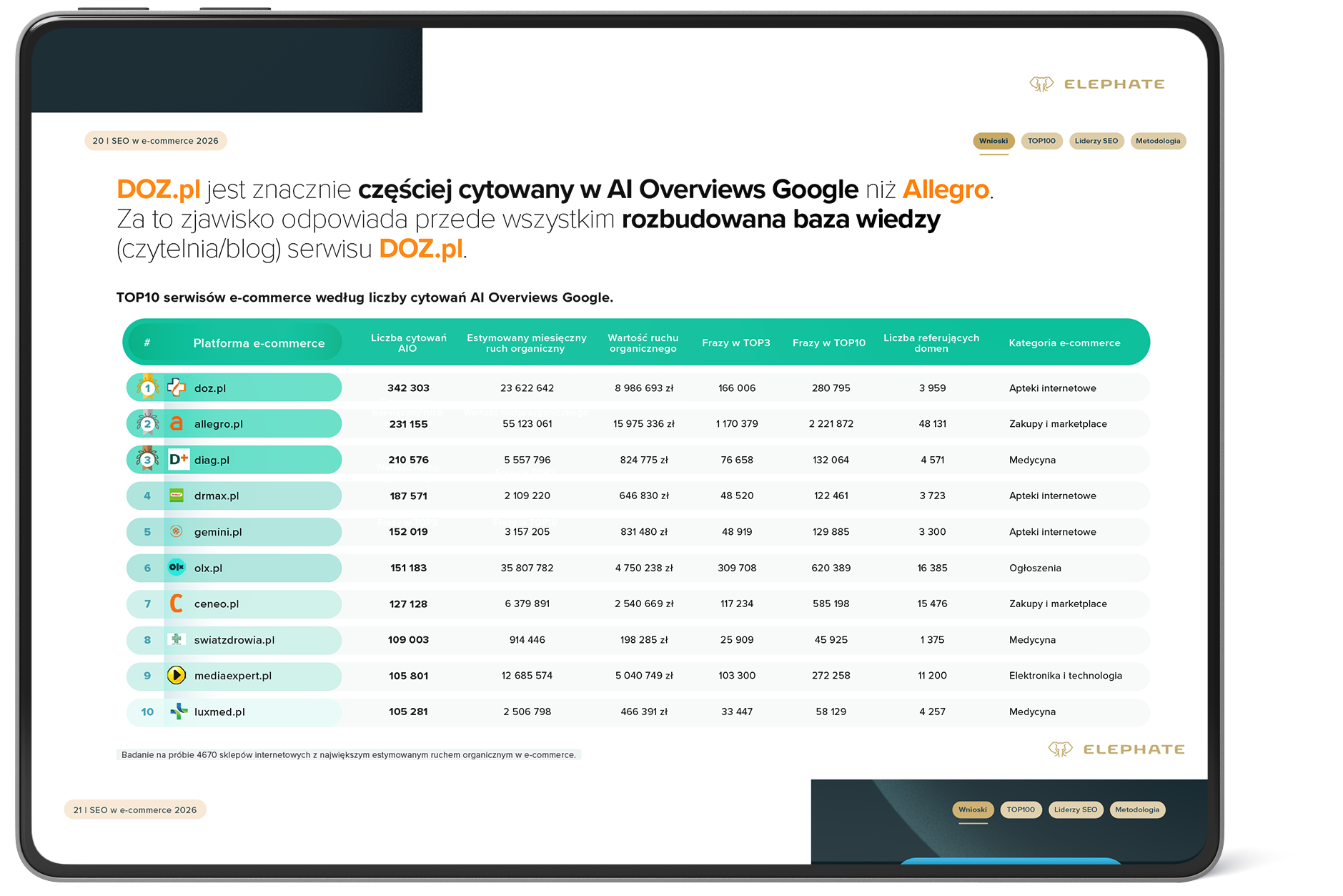 Jeszcze niedawno liczyły się pozycje i kliknięcia. Dziś coraz większe znaczenie ma to, czy marka pojawia się w odpowiedziach generowanych przez AI. Czy SEO w e-commerce nadal napędza sprzedaż, czy jego rola właśnie się redefiniuje? Odpowiedzi dostarcza raport Elephate „SEO w e-commerce 2026. Ranking sklepów internetowych z największą widocznością SEO oraz AIO w Google”, oparty na analizie 4670 sklepów internetowych działających w Polsce. W badaniu uwzględniono m.in. ruch z Google, widoczność, liczbę domen linkujących oraz obecność w AI Overviews.