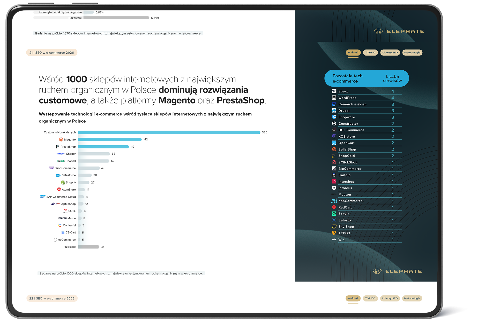 SEO w e-commerce 2026 nie istnieje bez technologii. Z raportu wynika również, że w TOP1000 dominują rozwiązania custom, Magento, PrestaShop. Technologia nie jest już zapleczem marketingu, jest jego warunkiem.