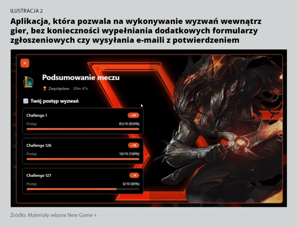 - Działanie wewnątrz gry. Aby uniknąć przerywania rozgrywki, co jest istotne w gamingu, zbudowaliśmy natywną aplikację z wykorzystaniem Overwolf (narzędzia, którego miliony graczy używają do rozszerzania funkcjonalności gier). Dzięki oficjalnej licencji i integracji z API gier League of Legends, Valorant i Teamfight Tactics, gracz akceptował wyzwanie (np. „zdobądź doublekilla”), a Overwolf automatycznie wykrywał jego wykonanie w czasie rzeczywistym i przyznawał nagrodę. Dzięki temu gracze mogli uczestniczyć w zabawie bez dodatkowego wysiłku.