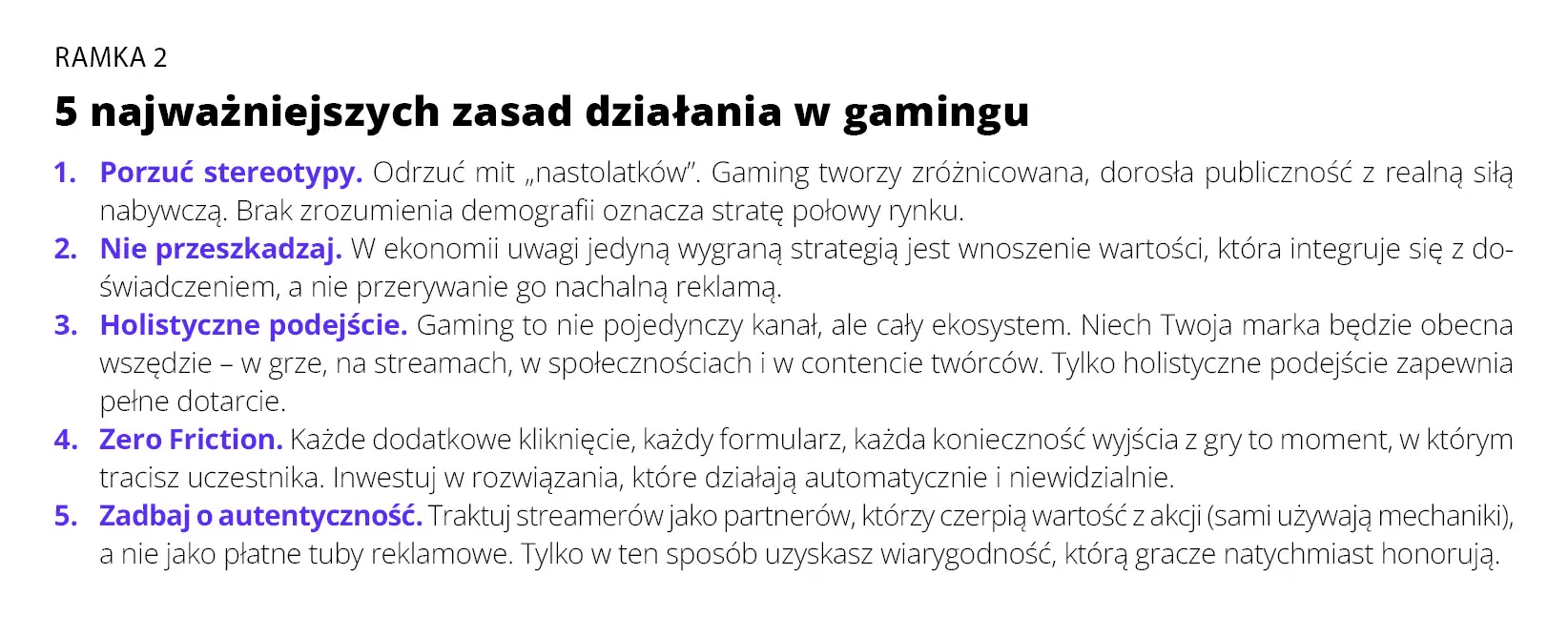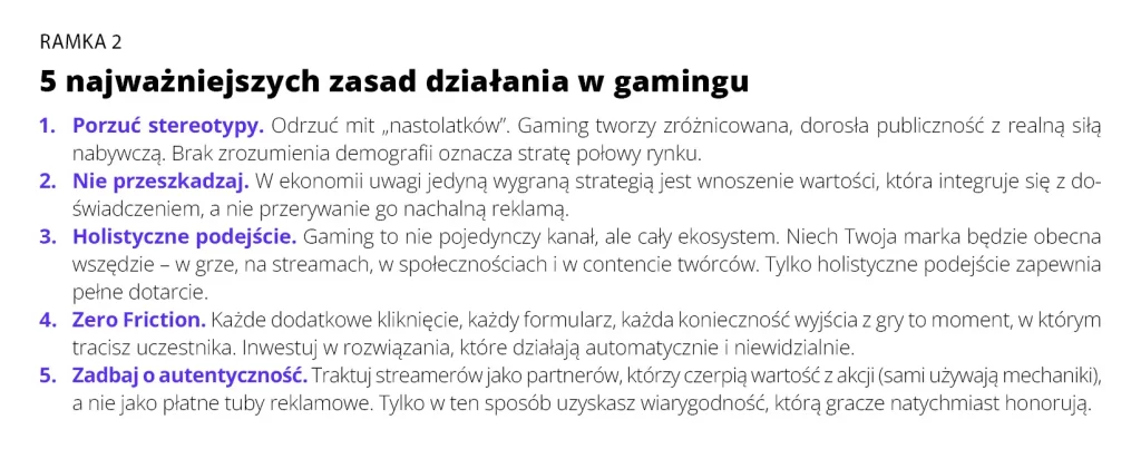 Gaming rządzi się własną logiką, a marki odnoszą sukces tylko wtedy, gdy potrafią się do niej dostosować. Pięć zasad opisanych w ramce 2 to kompas dla marketerów, którzy chcą wejść w ten świat skutecznie i wiarygodnie.