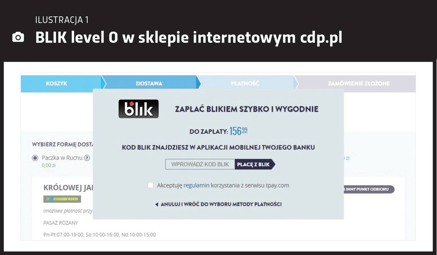 1. BLIK level 0. Dzięki takiej integracji kod BLIK wpisywany jest przez płatnika bezpośrednio na stronie sklepu (ilustracja 1/[zaznaczenie]). Wymagane jest uprzednie wdrożenie tej metody przez API wystawione przez pośrednika płatności. W efekcie klient zyskuje wygodę w postaci mniejszej liczby przekierowań i szybkiej autoryzacji płatności. BLIK level 0, mimo świetnego działania, nie jest jednak tym, czego wszyscy od płatności mobilnych oczekują – zapłatą jednym kliknięciem. Od niedawna jest to możliwe dzięki kolejnemu etapowi upowszechniania tej metody.