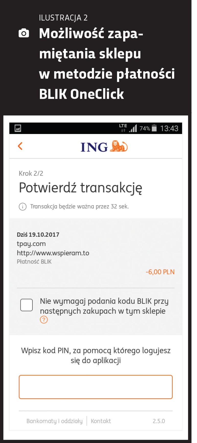 2. BLIK OneClick. Pierwsza transakcja ma standardowy przebieg, w ramach którego przepisuje się kod BLIK w serwisie transakcyjnym. Różnica jest jedna, ale znacząca. Po akceptacji płatności w telefonie pojawia się możliwość zapamiętania sklepu, tak aby przy kolejnych zakupach pominąć krok z przepisywaniem kodu ([zaznaczenie]ilustracja 2). Przy kolejnej płatności aplikacja sama wyświetla powiadomienie o tym, że pojawiła się nowa transakcja, którą wystarczy jedynie zaakceptować, klikając przycisk OK. W ten sposób BLIK jeszcze bardziej uprościł regularne płatności w sklepach, w których często robione są zakupy.