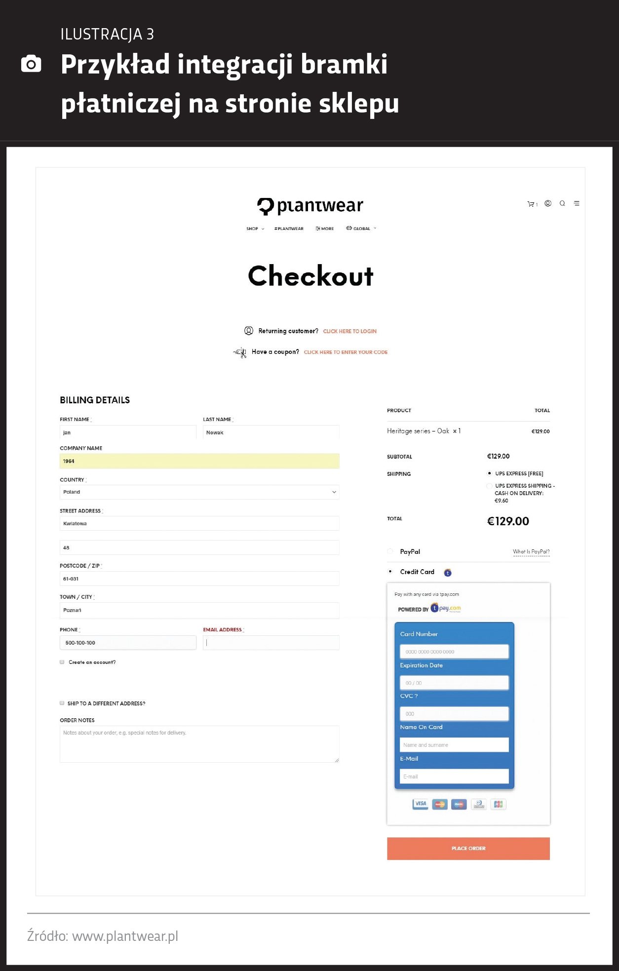 Sporym uproszczeniem procesu zakupowego jest integracja bramki płatniczej bezpośrednio na stronie sklepu. Tak eksponowana bramka to mniej przekierowań, ale i możliwość dostosowania jej do layoutu strony. Klient w jeszcze większym stopniu utożsamia się ze sklepem, bo na żadnym etapie nie musi go opuszczać, będąc przekierowywanym do zewnętrznego pośrednika obsługującego płatność (ilustracja 3).