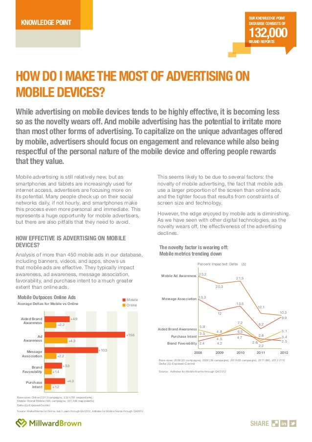 Analiza ponad 450 reklam online (filmy, bannery, aplikacje), które znajdują się w bazie danych MillwardBrown pokazuje, że ich emisja jest skuteczna przy wykorzystywaniu na urządzeniach przenośnych. Najlepsze z mobilnych kreacji, w porównaniu ze standardowymi reklamami online, pozwalają zwiększyć świadomość marki wśród odbiorców o 17%, a zamiar dokonania zakupu o 18%.