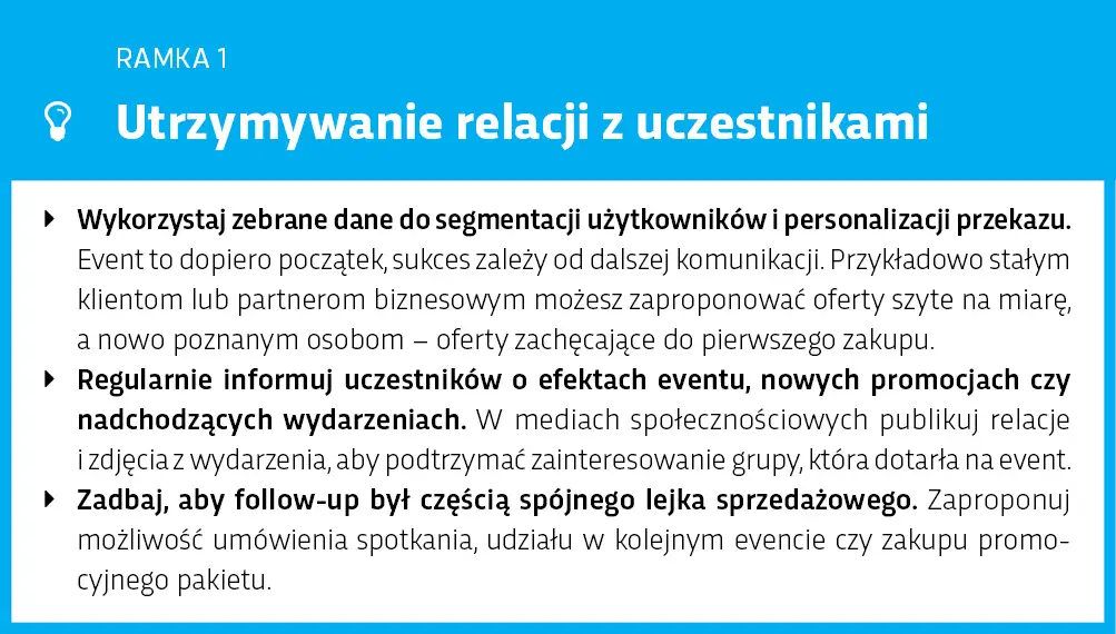 - jak zaangażować uczestników eventu, zdobyć ich dane kontaktowe i przekształcić zainteresowanie w sprzedaż,