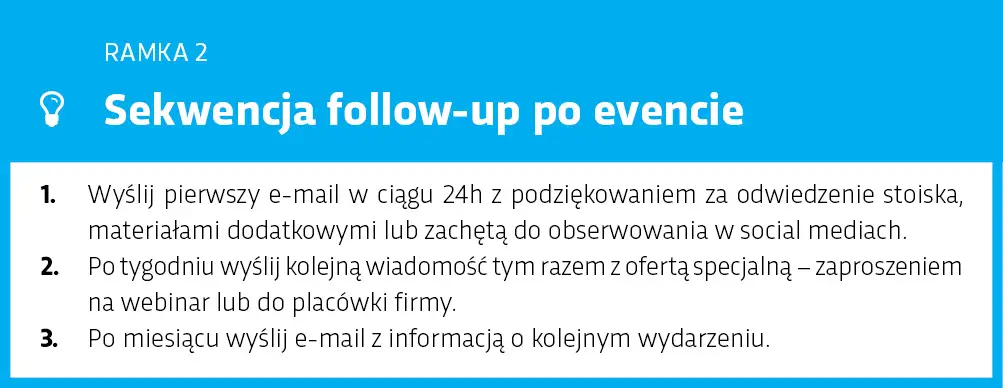 Po evencie podtrzymaj kontakt z uczestnikami (ramka 1). Zaplanuj automatyczną sekwencję follow-up (ramka 2). Wysyłka e-maili do osób, które odwiedziły stoisko, utrzymuje ich zaangażowanie i zachęca do dalszych działań (zakupu czy umówienia spotkania). Profesjonalny follow-up naprawdę procentuje. Dzięki temu inwestycja w wydarzenia lokalne zwraca się wielokrotnie, nawet długo po ich zakończeniu.