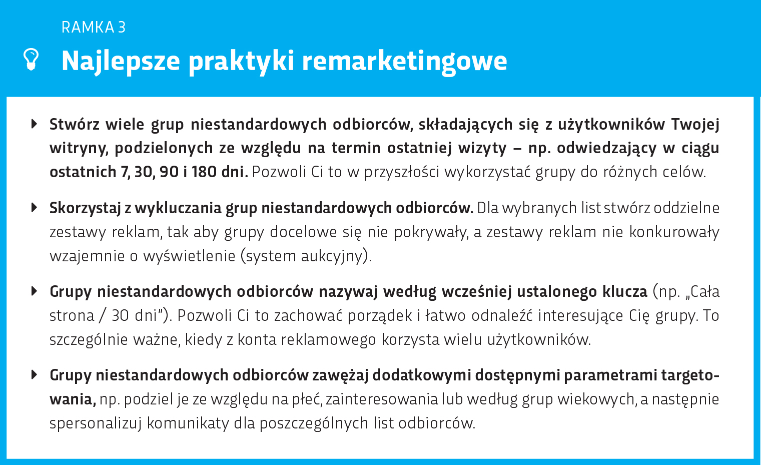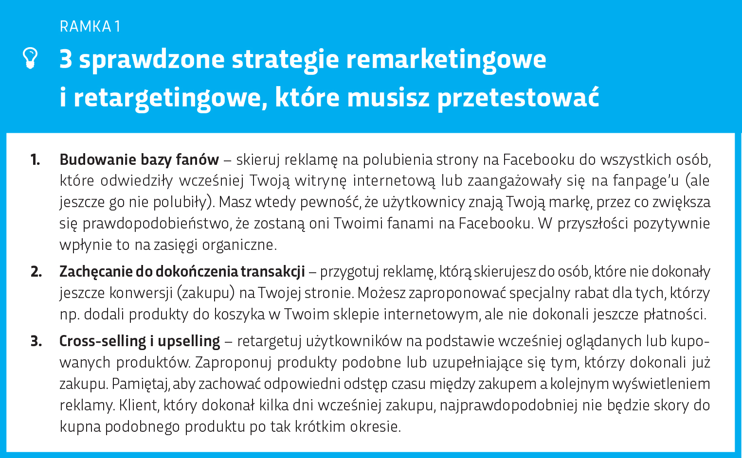 Im bardziej szczegółowo rozpiszesz ścieżkę swojego klienta, tym lepiej. Zastanów się, jakie informacje oraz bodźce będą kluczowe dla Twojego odbiorcy w momencie, w którym znajduje się on na ścieżce zakupowej. Pamiętaj, że Twoim głównym celem jest „przesunięcie” klienta w dół lejka. Testuj różne warianty i formaty reklamowe, dostosuj komunikaty do poszczególnych etapów. Informacje o trzech uniwersalnych strategiach remarketingowych i retargetingowych, które musisz przetestować, znajdziesz w ramce 1.