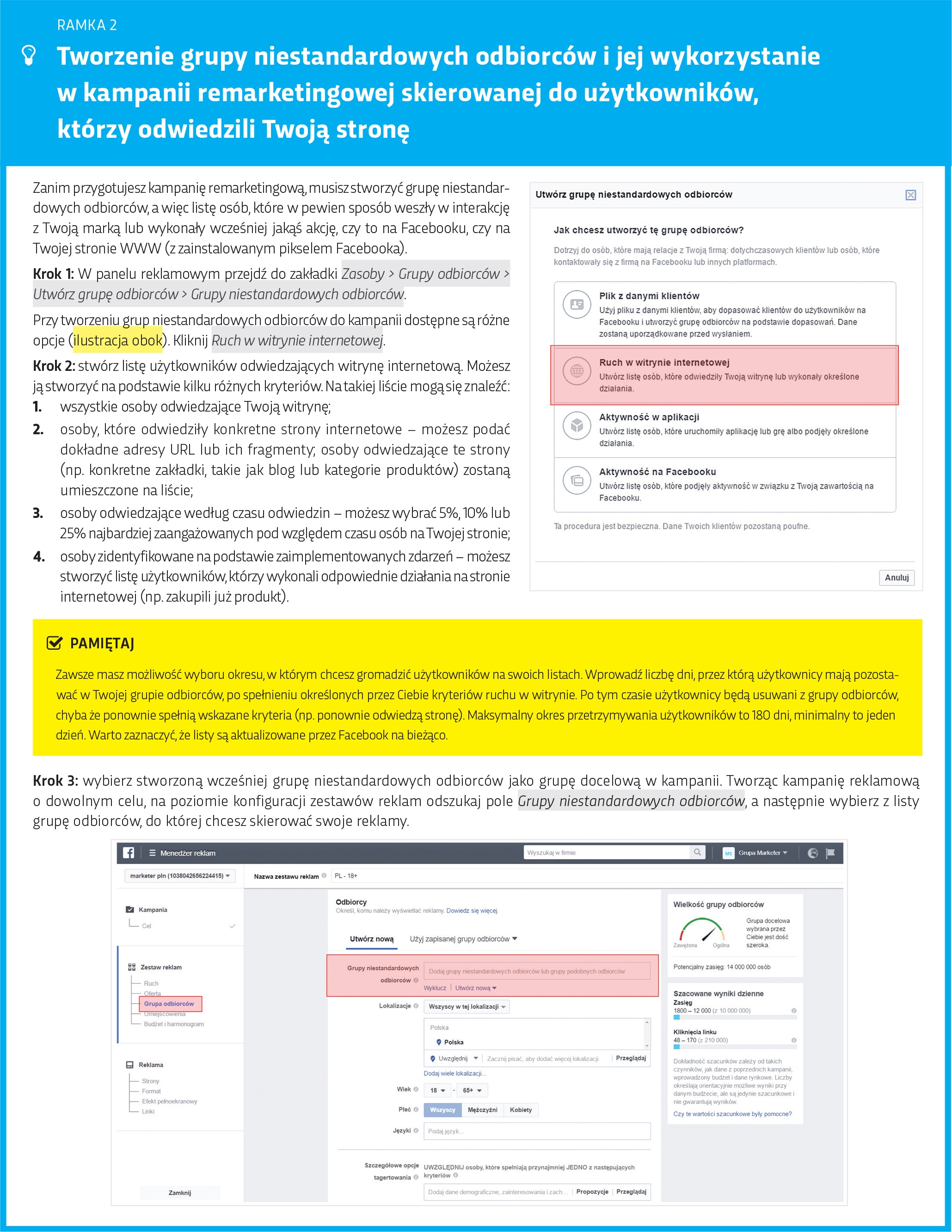 Poznałeś podstawowe założenia, którymi rządzą się kampanie retargetingowe na Facebooku. Teraz przeprowadzę Cię krok po kroku przez etapy ustawiania podstawowej kampanii w remarketingu na osoby, które odwiedziły Twoją stronę ramka poniżej.
