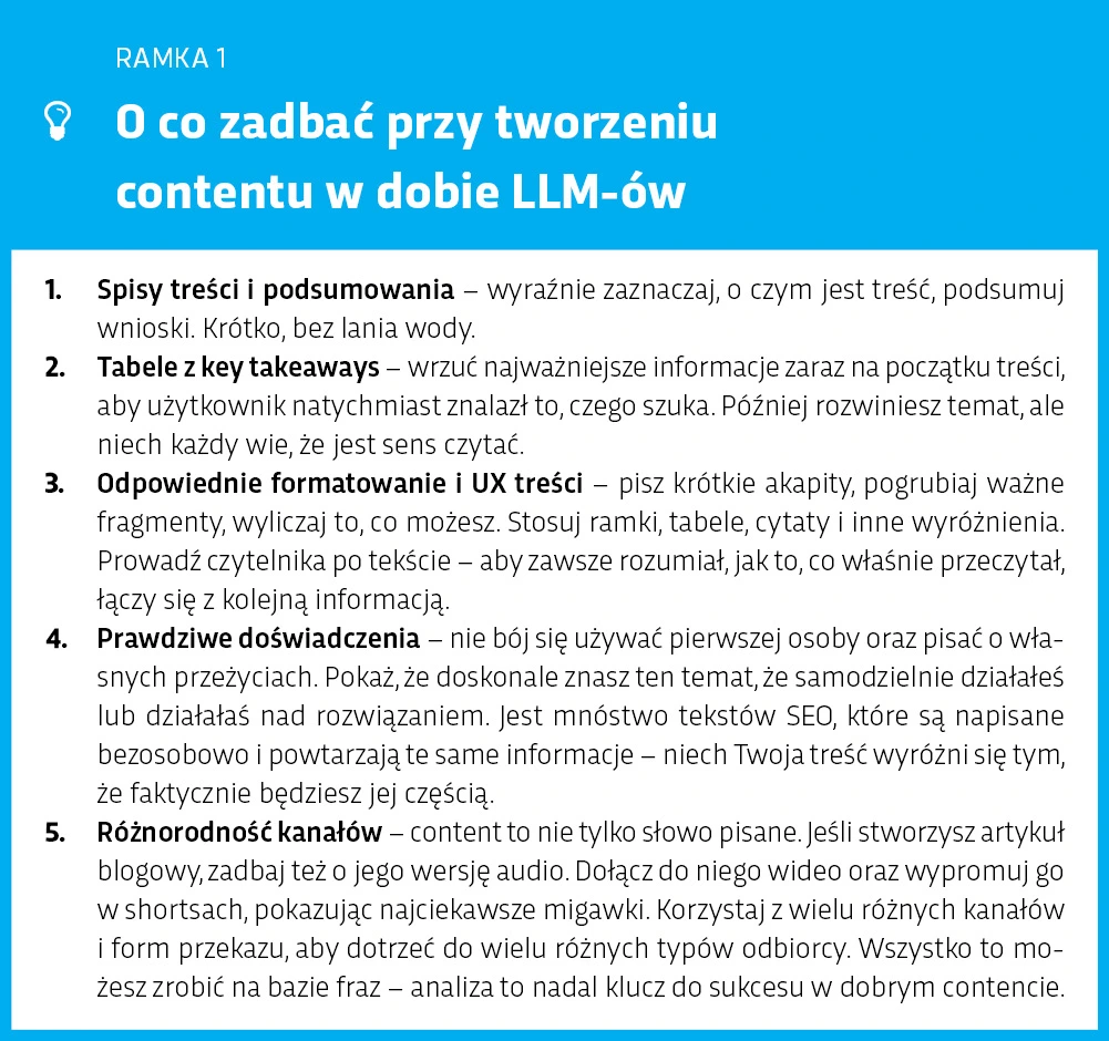 Jeśli chodzi o content, to ci, którzy tworzą go zgodnie z zasadami E-E-A-T (mówiąc między nami – jeśli jeszcze nie masz boksów z autorami treści, którzy są prawdziwymi ludźmi i znają się na tym, o czym piszą, to ostatni dzwonek, aby nawiązać z nimi kontakt), nie muszą wiele zmieniać. Jest jednak kilka szczegółów, o które warto zadbać w dobie LLM-ów (ramka 1).