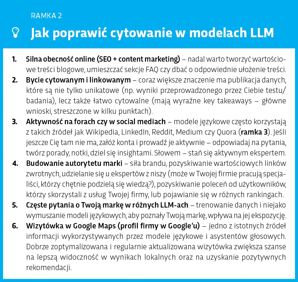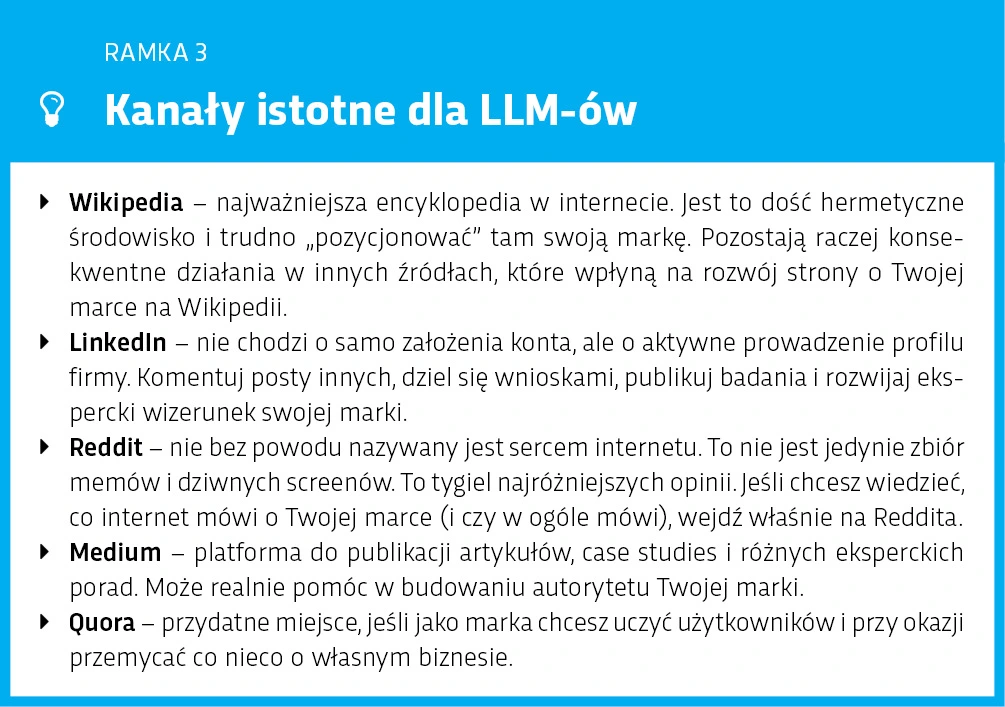 Jeśli myślisz długoterminowo o sile swojego brandu, nie możesz pomijać źródła ruchu z LLM-ów. Jest kilka sposobów, które mogą pomóc, aby ChatGPT lub inny model wymieniał Twoją markę jako jedną z pierwszych (ramka 2).