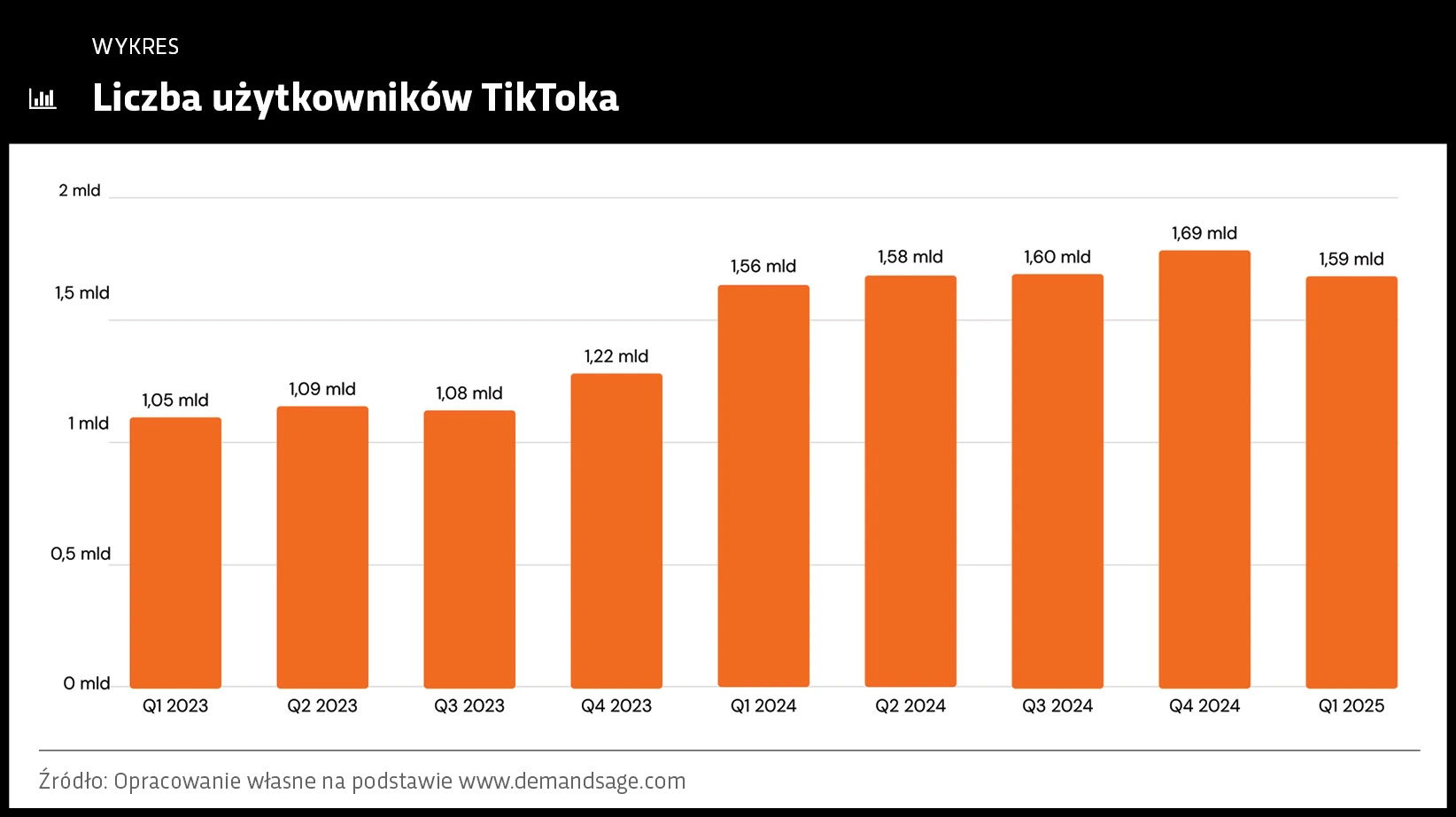 Dobrze widać to na przykładzie TikToka, który w ostatnich latach znacząco zwiększył liczbę użytkowników. Jeszcze w 2021 r. było to ok. miliarda użytkowników, natomiast obecnie (dane na pierwszy kwartał 2025 r.) jest to ok. 1,6 mld (wykres).
