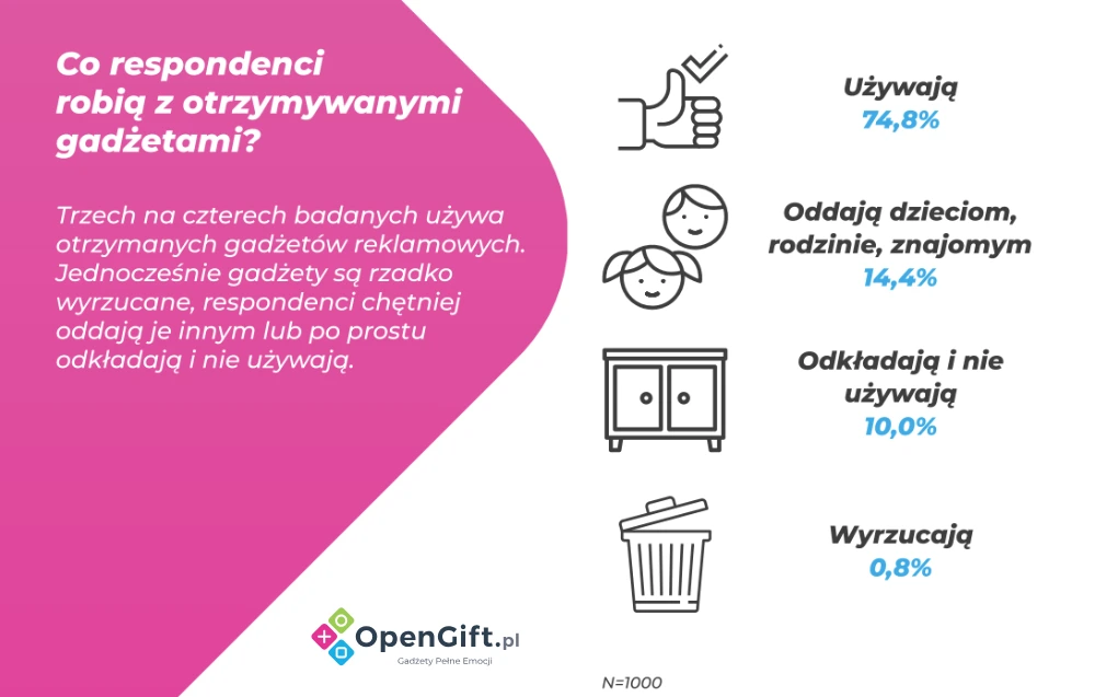 Druga warstwa historii to to, co dzieje się z gadżetem później. Wbrew obawom, że „i tak wszystko ląduje w koszu”, liczby mówią coś innego: 74,8% ankietowanych po prostu korzysta z otrzymanych upominków. Kolejne 14,4% przekazuje je dzieciom, rodzinie lub znajomym. Tylko 10% odkłada gadżet na półkę i do niego nie wraca, a zaledwie 0,8% przyznaje, że prezenty po prostu wyrzuca. Innymi słowy – dobrze zaprojektowany gadżet ma dużą szansę zostać z odbiorcą na dłużej albo „przenieść się” do kolejnego domu czy biura.