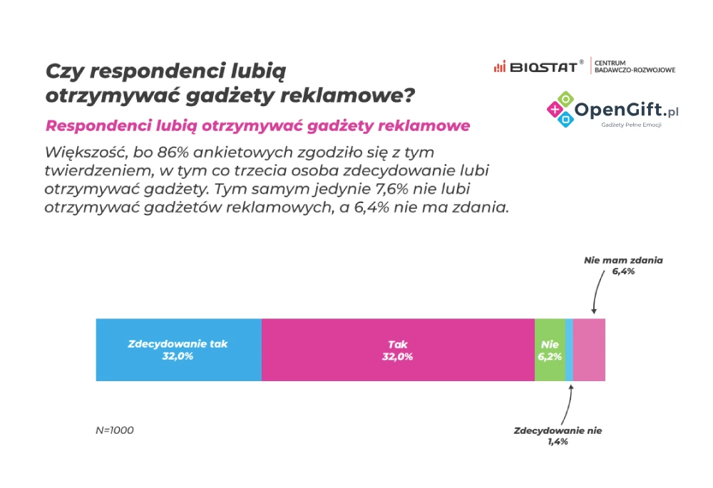 Po pierwsze – skala akceptacji. Aż 86% badanych deklaruje, że lubi otrzymywać gadżety reklamowe. Co ważne, to nie jest letnie „może być”: 32% odpowiada „zdecydowanie tak”, kolejne 32% – „tak”. Jedynie 7,6% przyznaje, że gadżetów nie lubi, a 6,4% woli nie zajmować stanowiska. Z perspektywy marketera oznacza to, że upominek jest formą kontaktu, którą zdecydowana większość odbiorców przyjmuje z sympatią – o ile jest sensownie dobrany.