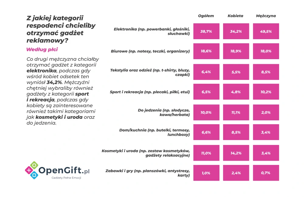 Na koniec raport odpowiada na pytanie, jakich gadżetów ludzie naprawdę chcą. Na pierwszym miejscu jest elektronika – wskazuje ją 38,7% respondentów. Dalej mamy artykuły biurowe (18,6%), kosmetyki i produkty z kategorii urody (11%), coś do jedzenia – od kawy po słodycze (10%), produkty do domu i kuchni (6,6%), tekstylia i odzież (6,4%) oraz gadżety sportowe i rekreacyjne (również 6,4%). Zabawki i gry to 1,9% wskazań, a kategoria „inne” – symboliczne 0,4%. To w praktyce gotowa ściąga do rozmowy z partnerem takim jak OpenGift.pl: jakie kategorie powinny otwierać katalog, jeśli celem jest lojalność, a nie tylko „odhaczenie” pozycji w budżecie.