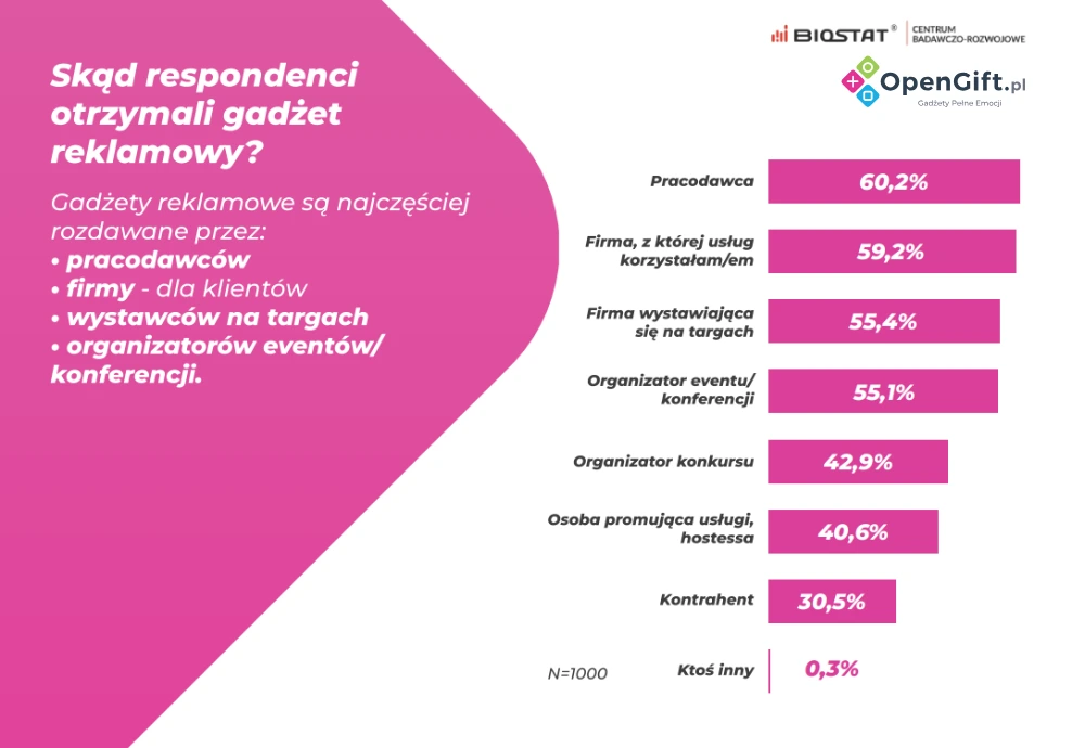 Kolejna warstwa to mapa punktów styku, w których klienci i pracownicy najczęściej stykają się z gadżetami. 60,2% otrzymało upominek od pracodawcy, 59,2% od firmy, z której usług korzysta, 55,4% od wystawcy na targach, a 55,1% od organizatora eventu lub konferencji. Do tego dochodzą organizatorzy konkursów (42,9%), hostessy i promotorzy (40,6%) oraz partnerzy biznesowi (30,5%). Dla osób odpowiedzialnych za strategię marketingową czy HR jest to jasna wskazówka, w których punktach ścieżki klienta i pracownika inwestycja w gadżety ma największy sens.