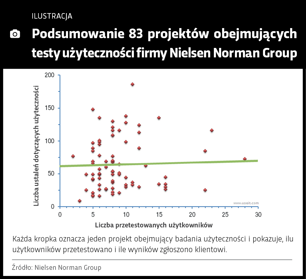 - Według Nielsen Norman Group już przebadanie pięciu–ośmiu osób pozwala wykryć ok. 80% błędów w rozwiązaniu. J. Nielsen, „How Many Test Users in a Usability